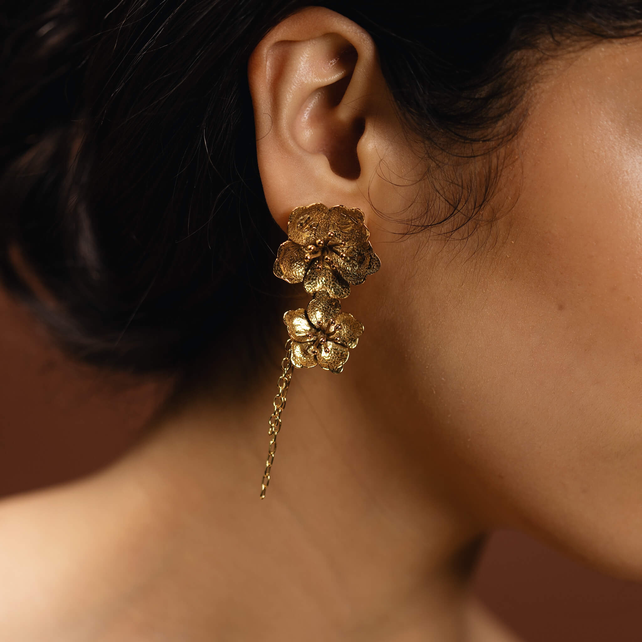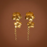 Inspired by delicate cherry blossoms, these charming earrings feature a graceful dangling chain design finished in 18k gold plating. Perfect for adding a touch of botanical beauty to your everyday style or special occasions. A playful yet elegant statement piece that transforms any outfit.
